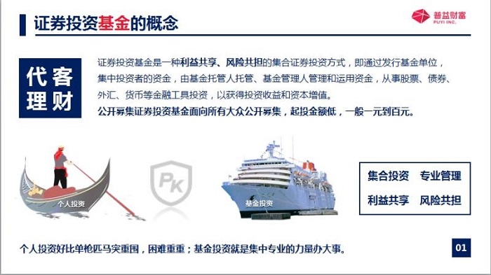把這些資金呢投資于股票債券外匯貨幣等金融工具的一種集合投資方式,也就是說不止投資單一只股票,也不止投資單一只債券,而是投資多只股票或者多只債券的一種集合投資方式,極大地分散的風(fēng)險,因?yàn)樵蹅兌贾离u蛋不能放在同一個籃子里面,并且呢,公募基金是面向所有大眾公開募集的,起投金額是比較低的,一元起投呀,百萬元起投呀,千元起投。這對于很多投資者來說呢,都是可以接觸的到的,那如果說拿個人投資跟基金投資進(jìn)行比較的話,就像在海里面航行一樣,個人投資就像一個孤身備戰(zhàn)的小姑船一樣,那基金投資,因?yàn)樗澈笥幸徽麄€團(tuán)隊進(jìn)行運(yùn)作,那他的專業(yè)非常強(qiáng),所以呢,它就是集中專業(yè)的力量辦大事。