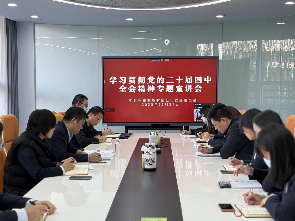2025年11月27日,恒銀期貨有限公司在總部會議室設立主會場,召開學習貫徹黨的二十屆四中全會精神宣講報告會。河北國富投資副總經(jīng)理、恒銀公司黨支部書記、董事長李剛作專題宣講,公司全體黨員和積極分子現(xiàn)場參會,公司外地黨員及從業(yè)人員通過線上會議同步學習。
